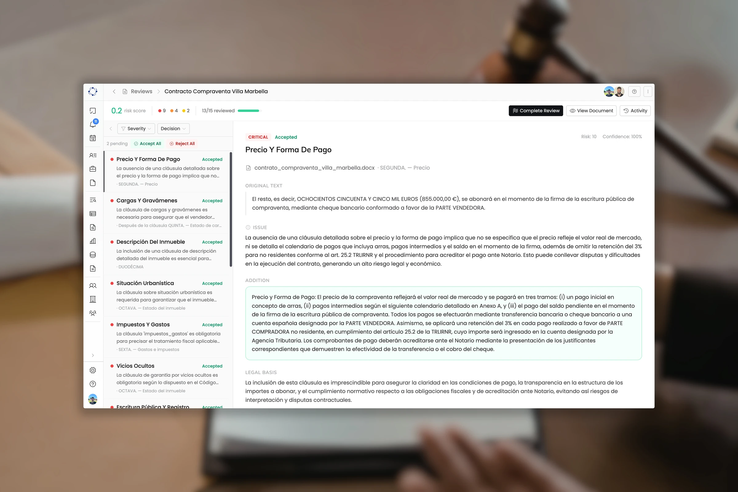 Each finding shows risk level, clause text, and playbook rule