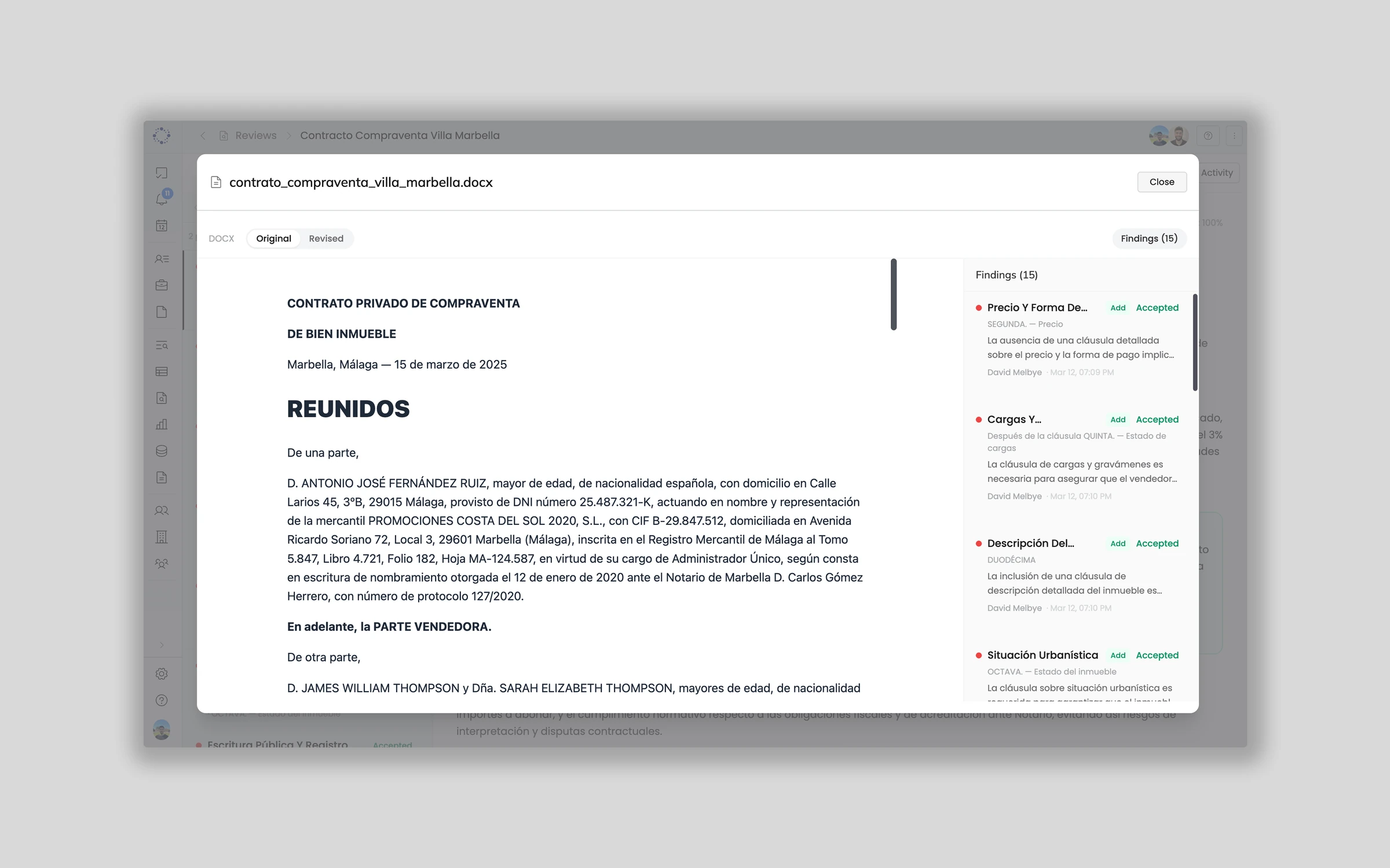 Accept or modify findings, then download the revised contract as a Word document. Choose a clean version with all changes applied, or a redline version with tracked changes showing original text struck through and new language highlighted. The output is compatible with standard Word review workflows, ready to send to counterparties.