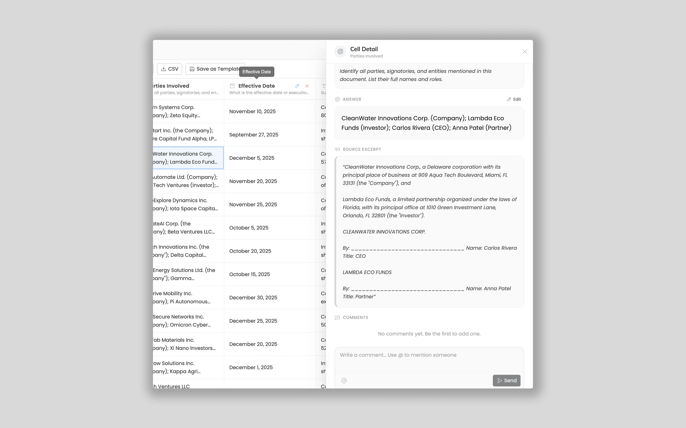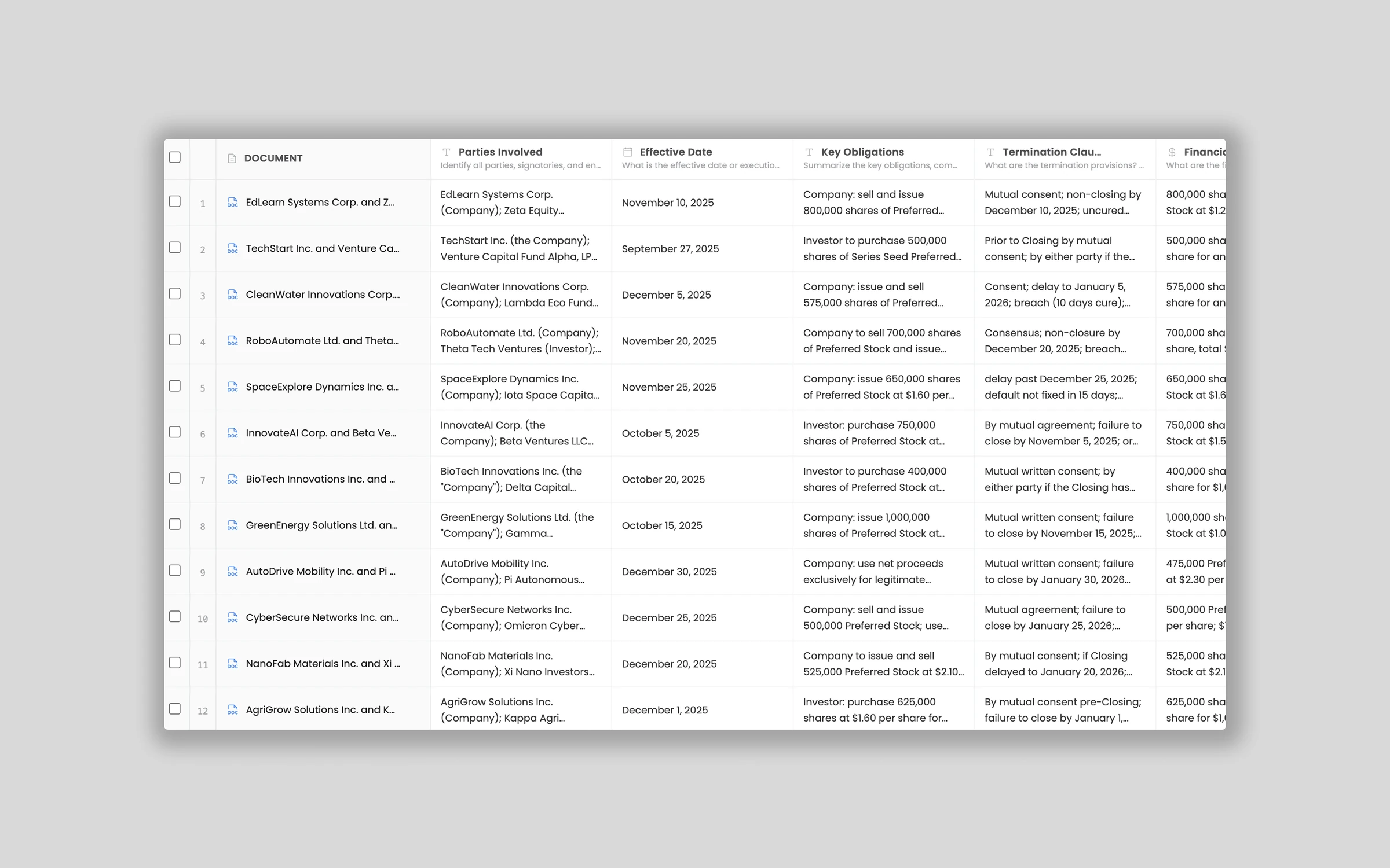 Download the results as a structured report with extracted terms, flagged risks, and confidence levels organized by contract and by clause type. The report is ready for investment committees, board presentations, or integration into your existing deal management tools.