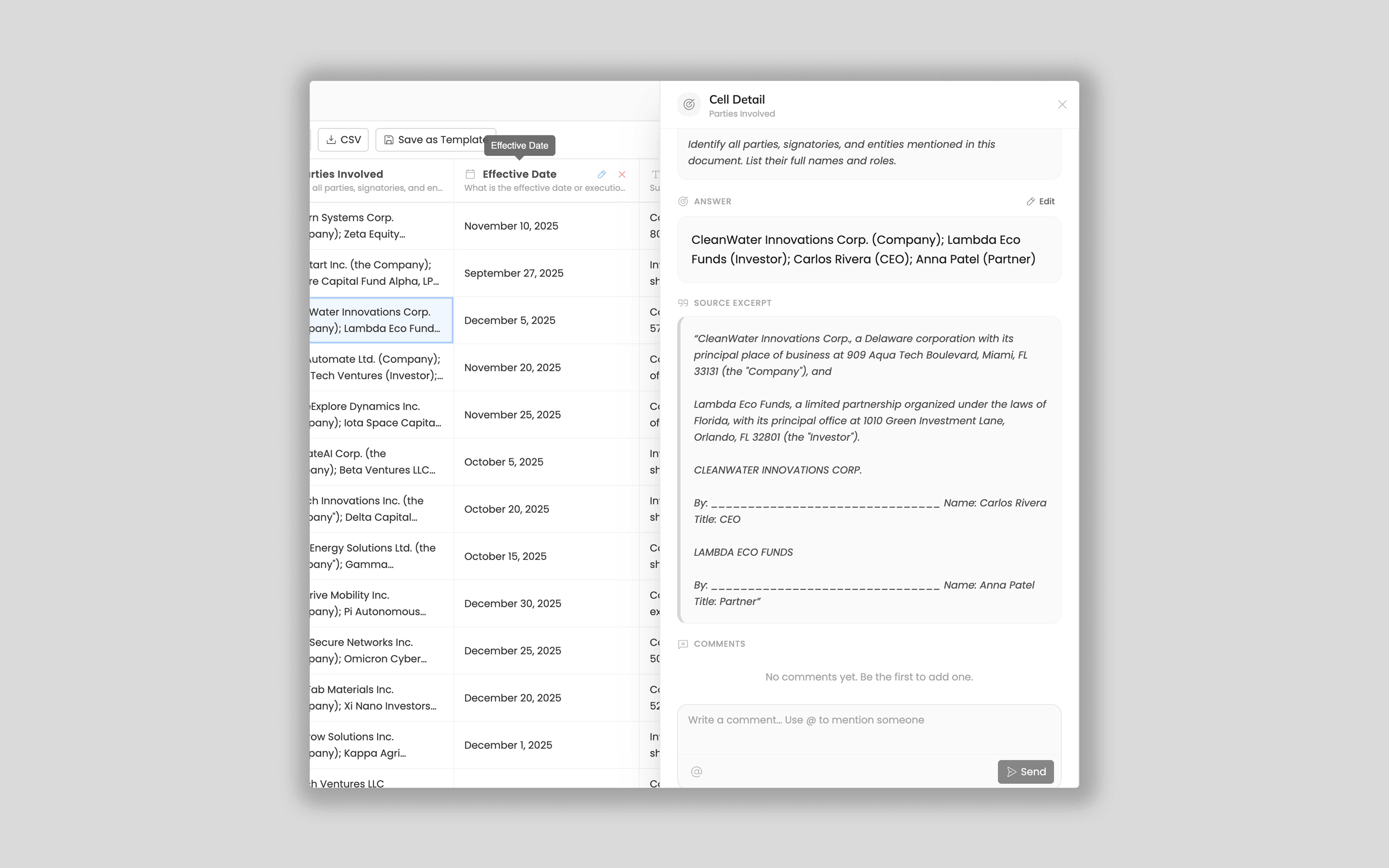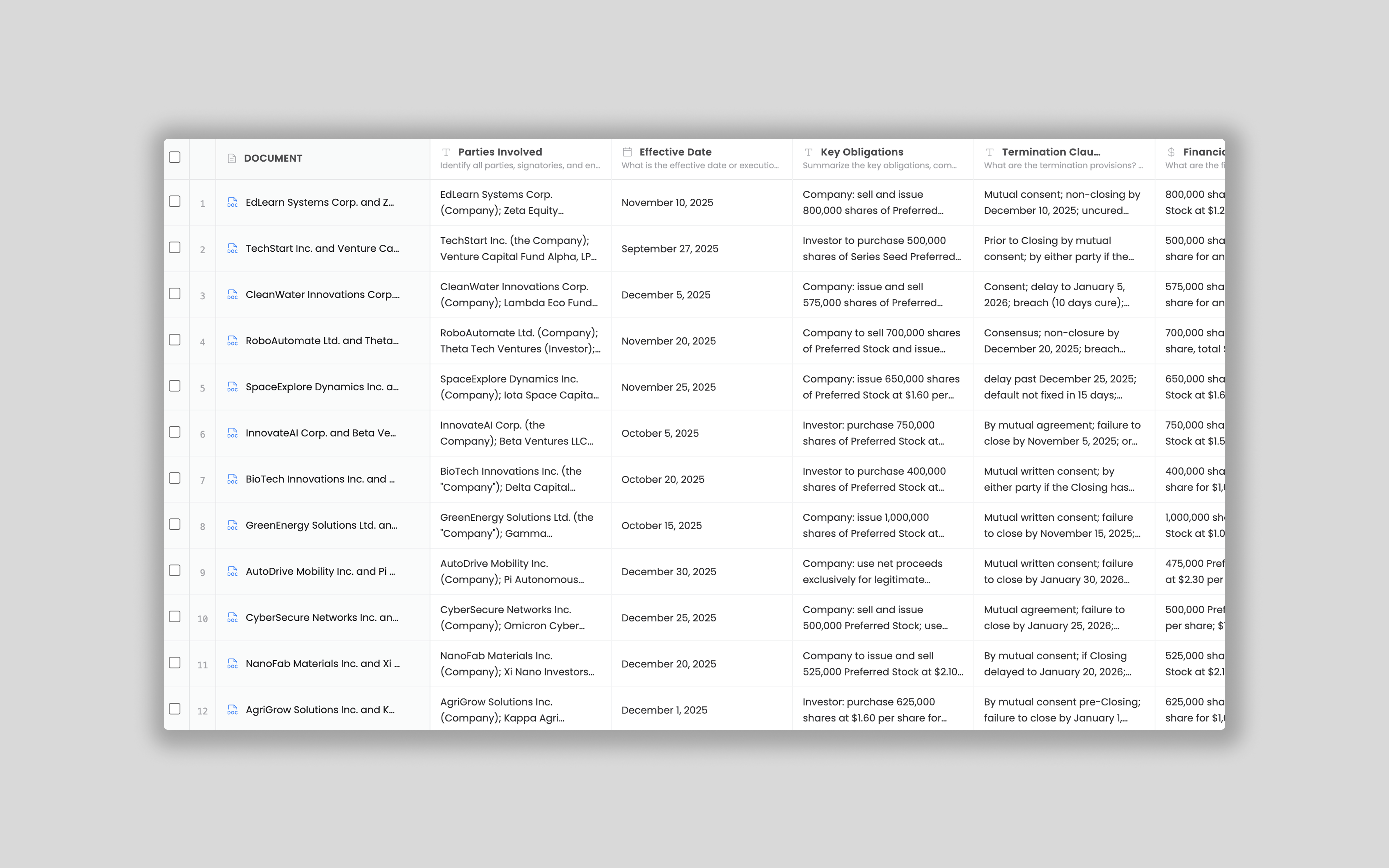 Download the results as a structured report with extracted terms, flagged risks, and confidence levels organized by contract and by clause type. The report is ready for investment committees, board presentations, or integration into your existing deal management tools.