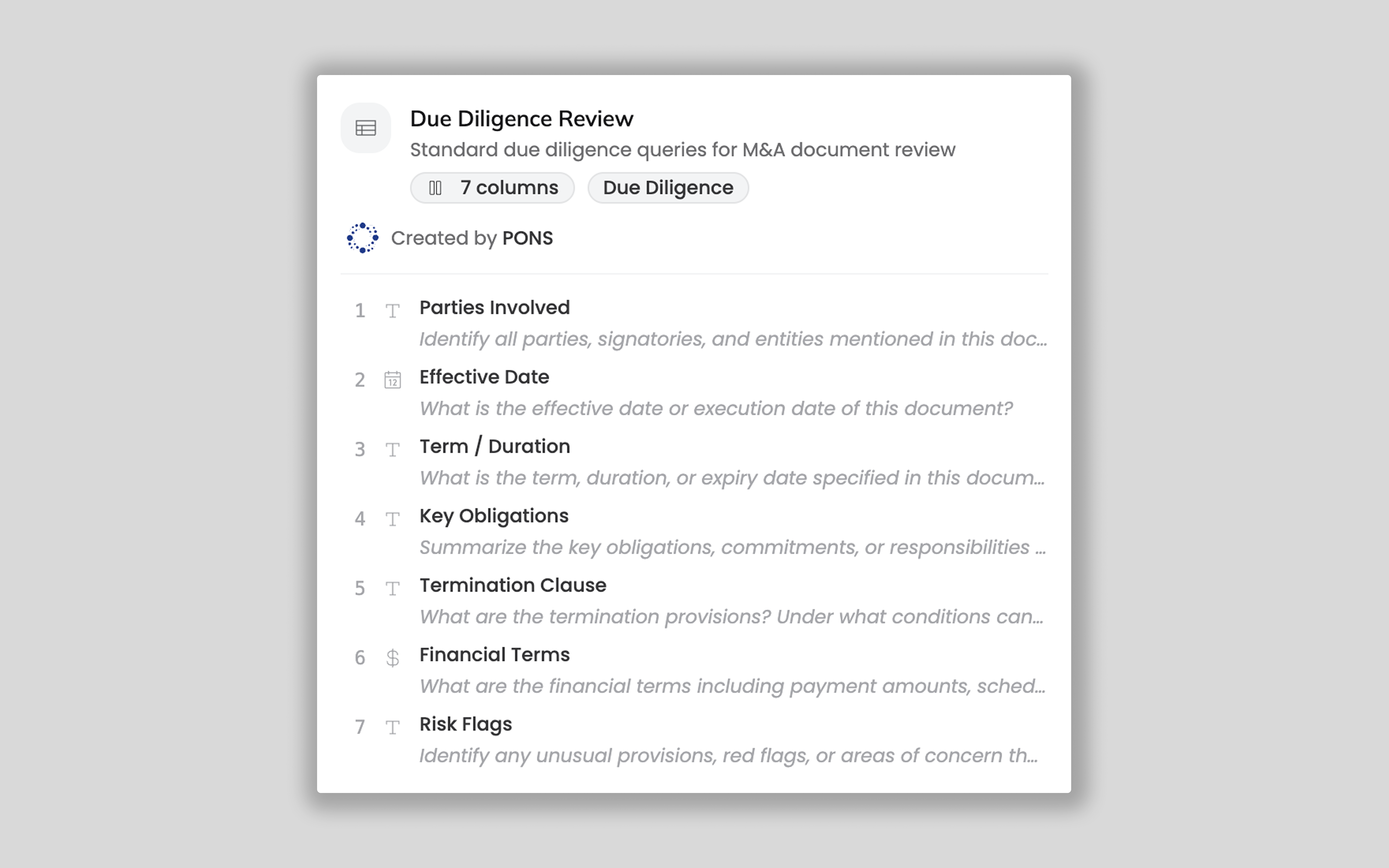 Upload hundreds of contracts from a data room, define the clauses and terms you care about, and PONS processes them instantly. You get a structured report with extracted findings, risk flags, and confidence scores your deal team can act on immediately.